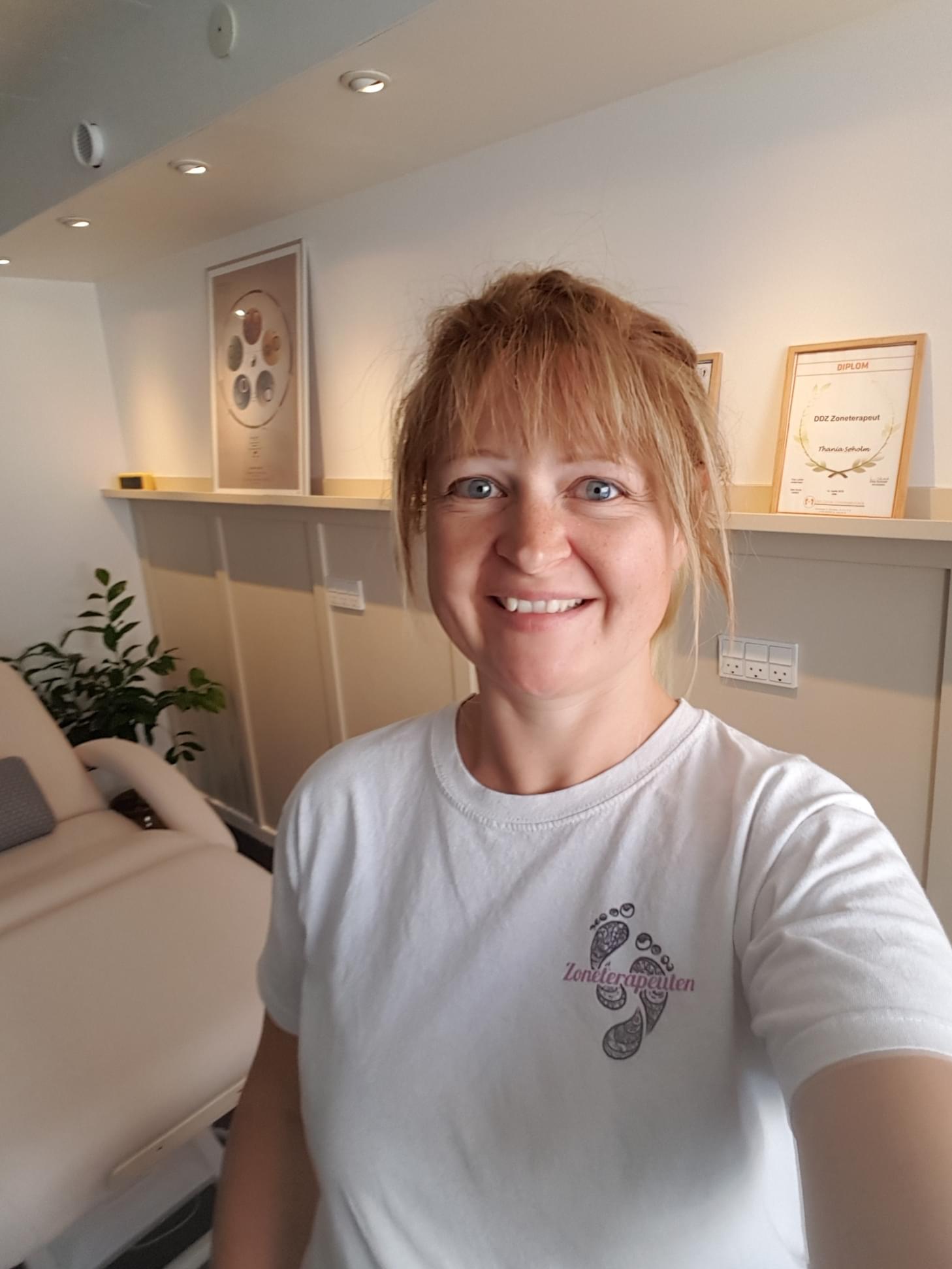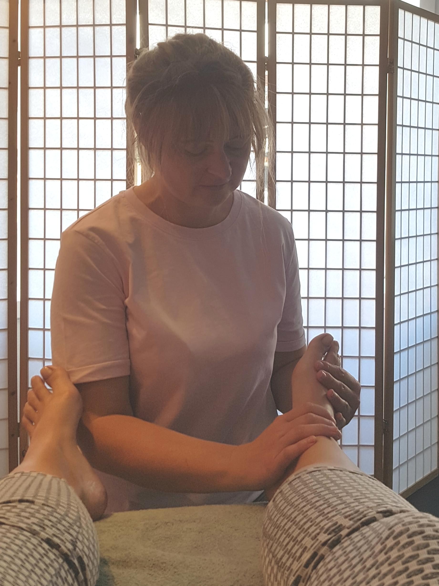 Efterfølgende vil du få zoneterapi, hvor behandlingen foregår ved, at du ligger dit til rette på briksen med bare fødder. Jeg vil side for enden af briksen og behandle, hovedsageligt på fødderne, men jeg kan også vælge at benytte akupressurpunkter og meridianbaner på hele kroppen. Selve behandlingen er dejlig afslappende og kan virke næsten terapeutisk i sig selv.
